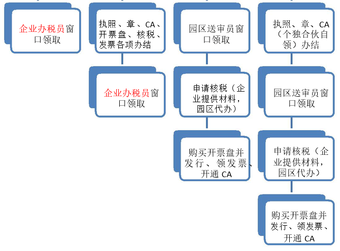 2、園區(qū)通道:辦結(jié)后可領(lǐng)執(zhí)照、公章、發(fā)票章、法人章、財務(wù)章、CA數(shù)字證書(注:僅有限公司可領(lǐng),個獨、合伙需企業(yè)自行領(lǐng)取,可全市通辦)等,四個章默認為基礎(chǔ)款橡皮章,免費,適合暫不需要開票的有限公司,市場所辦理的個人獨資、合伙企業(yè)只可選擇園區(qū)通道辦理模式。該模式的企業(yè)后續(xù)有核稅需要,聯(lián)系園區(qū)代辦。